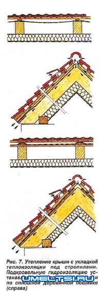 Проникновению влаги к элементам крыши способствует, например, неаккуратная укладка паронепроницаемого слоя на внутренней поверхности утеплителя, недостаточное перекрывание полос пароизоляции, их неплотное примыкание к стенам и трубам, случайные разрывы и другие обстоятельства. Поэтому первое, о чём следует позаботиться при утеплении крыши, — устройство надёжной пароизо-ляции со стороны внутренних помещений. Со стороны кровли утеплитель должен быть защищен от влаги слоем гидроизоляции, которую укладывают по стропилам или по специальному настилу.