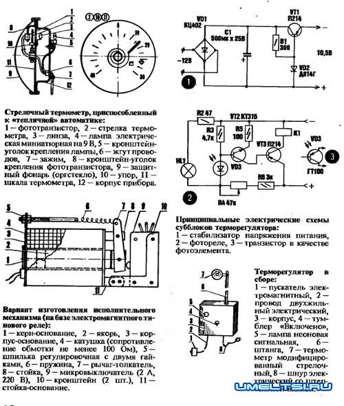 Датчиком температуры служит стрелочный термометр. Самый что ни на есть обычный, бытовой. Но чтобы столь заурядный прибор приобрел новые, несвойственные ему прежде качества, термометр подвергают доработке. Для этого прежнюю конструкцию аккуратно разбирают. В шкале, где располагается область нужного вам предела регулирования, высверливают отверстие диаметром не более 2,5 мм. Напротив крепят фототранзистор. Для этого берут тонкую жесть или листовой алюминий, изготавливают уголок и сверлят в нем отверстия 0 2,8 мм — для фототранзистора. Последний аккуратно промазывают клеем по кромке и плотно вставляют в подготовленное для него гнездо. Сам уголок также прикрепляют к шкале. Лучше всего — с помощью нлея «Момент». Затем чуть ниже отверстия крепится (на нее) упор, изготовленный в виде уголка. Он необходим для того, чтобы при температуре, выше требуемой (в дневное время), стрелка не смогла беспрепятственно пройти отверстие — иначе ведь снова включится обогрев.