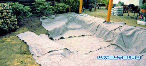 2. Дно застилают нетканым материалом (защищает плёнку от корней и камней).