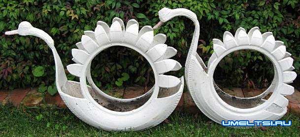 Кто более по опытнее тот может себе сделать разнообразные подделки из шин: лебеди, пальмы, божьи коровки, лягушки и многое другое. Если у вас есть дети дошкольного возраста, то как же обрадуется воспитательница детского садика узнав о вашем уменье из шин создавать красоту и возможно попросит вас это сделать для сада, радовать детишек.