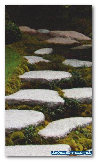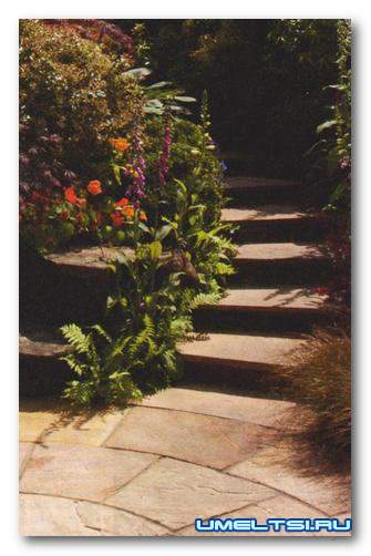 При их устройстве обязательно нужно сделать ограничивающий бордюр. В английских пейзажных садах широко используют гравийные покрытия. На дорожку из гравия можно уложить на расстоянии шага бетонные плиты неправильной формы. Естественно выглядит также пошаговая дорожка из плитняка, когда расстояние между камнями достаточно большое и промежутки зарастают травой, мхом или другими почво-покровными растениями. Для узкой, извилистой дорожки, например, вокруг озера подойдет покрытие из мелкой гальки.