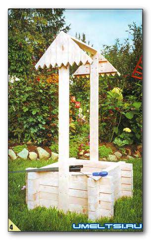 Для ворота колодца я использовала отрезок бревна, сняв с него кору и просушив в теплом месте. Для крепления ворота в бревне с помощью длинного сверла делают сквозное отверстие. Если это не получается, бревно можно распилить или ровно расколоть и в обеих половинках выбрать стамеской канавку нужного размера. Затем половинки бревна склеивают водостойким клеем или «жидкими гвоздями», зажав в двух-трех местах струбиинами. В ворот протягивают резьбовую ось и крепят гайками в отверстиях, предварительно просверленных в боковых стойках колодиа. Ручку ворота можно изготовить из черенков лопат или выпилить из широкой доски, как в предложенном мной варианте.
