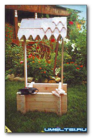Только от вашей фантазии зависит, наделите вы декоративный колодец какой-либо дополнительной функцией или нет. Следуя садовой моде, многие разбивают в них цветнички. В этом случае я бы посоветовала высаживать здесь растения, цветки которых окрашены в синие и голубые тона. Над сымитированной таким образом водной поверхностью можно повесить ведерко с ампельными растениями, свисающие стебли которых напоминают струйки воды. Внутренние стенки сруба колодца-цветочницы лучше проложить рубероидом или другим аналогичным материалом, чтобы древесина, соприкасаясь с землей, не гнила.