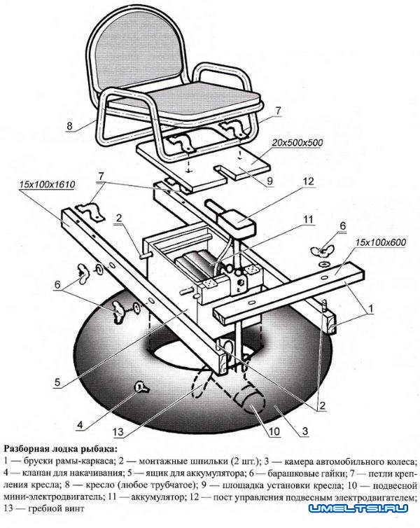 Лодка собрана из старой автомобильной камеры, тарного ящика, деревянных брусков и кресла. Всё остальное — из подручных средств.