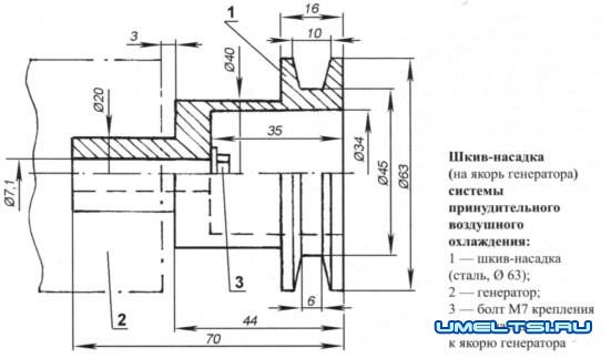 Как было отмечено в начале статьи, цилиндр двигателя оборудовал принудительным воздушным охлаждением. Крыльчатка центробежного типа — от салонной печки автомобиля УАЗ. Привод крыльчатки — через ремённую передачу со шкивами с передаточным числом 1. Приводной шкив смонтирован на роторе генератора. В качестве ремня использовано резиновое кольцо («пассик»), отрезанное от камеры мотоцикла «ИЖ» — оно не требует натяжения и легко снимается для отключения привода в прохладную погоду. Кожух выклеил из стеклоткани на эпоксидном связующем по предварительно изготовленному проволочному каркасу. Он (кожух) — быстросъёмный, закрепляется на цилиндре двумя пружинами. Но следует признать, что крыльчатка не в полной мере обеспечивает охлаждение цилиндра в экстремальных условиях при движении на низших передачах, а потому планирую её заменить.