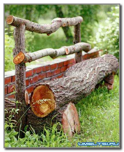 Стволы старых деревьев могут стать настоящей проблемой для сада. Дерево, кора которого покрылась трещинами и дуплами, лучше омолодить, не дожидаясь, пока оно сломается от ветра. А из спиленных частей получится удобная лавочка. Самые широкие спилы пустите на опоры. Из широкого бревна сделайте сиденье. Несколько толстых сучьев пригодятся для изготовления спинки.