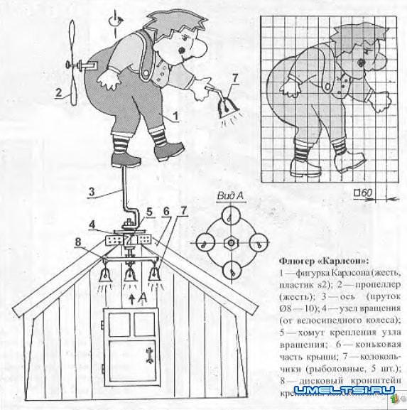 На коньке крыши дома я сделал флюгер «Карлсон». Конструкция его очень проста в изготовлении. Самого «Карлсона» изготовил из металлического листа толщиной 2 мм. Фигурку и стержень из прутка диаметром 8 — 10 мм жестко склепал между собой. В качестве узпа вращения использовал ступицу велосипедного колеса с подшипниками. Ниже закрепил жёстко большие рыболовные колокольчики (в указанных на эскизе местах). Такой же колокольчик и в руке «Карлсона». От естественной вибрации при вращении пропеллера и при порывах ветра все колокольчики звенят.