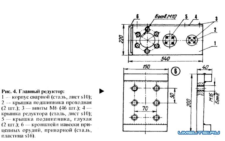 Главный редуктор — одна из трудоемких конструкций. Корпус у него сварной (рис. 4) из заготовленных заранее стальных пластин толщиной 10 мм с дисками усиления в местах установки подшипников с привинчиваемыми крышками. Швы — сплошные, исключающие подтеки масла. К задней (относительно движения мотоблока) стенке редуктора приварен кронштейн-скоба для крепления грузовой тележки (в паре с которой «Нильс» превращается в мини-трактор с «ломающейся» рамой) или прицепных сельскохозяйственных орудий. Например, плуга — через специальный узел заглубления (регулировки захода лемеха в почву).