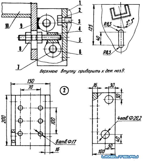 Натяжение приводных цепей обеспечивает специальный механизм, который крепится шпильками к выполненным из стального уголка ползунам. Последние тоже могут перемещаться, ослабляя или натягивая приводную цепь. Для этого в ползунах сделаны пазы и преду смотрены крепежные болты М10 и два регулировочных винта (на рисунке не показаны).