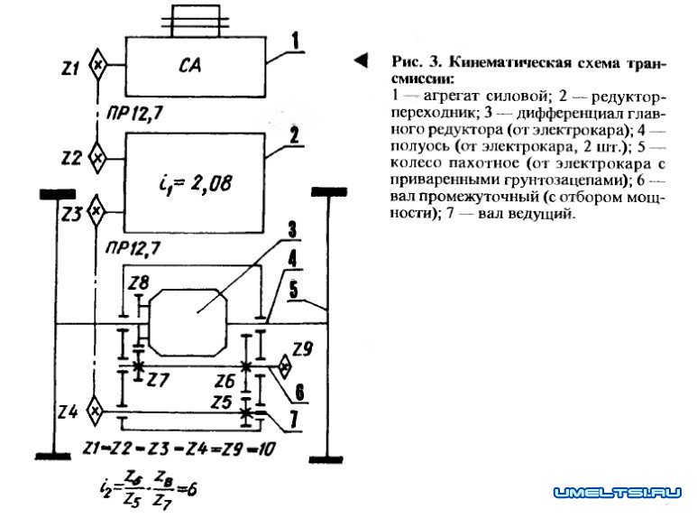 Успешная работа мотоблока во многом предопределена многоступенчатой кинематической схемой трансмиссии, обеспечивающей, в отличие от «типовых» аналогов, повышенное передаточное отношение и соответствующие крутящий момент и тяговое усилие на выходе. Помимо редуктора-переходника в кинематической схеме есть еще самодельный главный редуктор, образующий вместе с главной передачей и колесной парой, взятыми от списанного отечественного электрокара, высокоэффективный движитель.