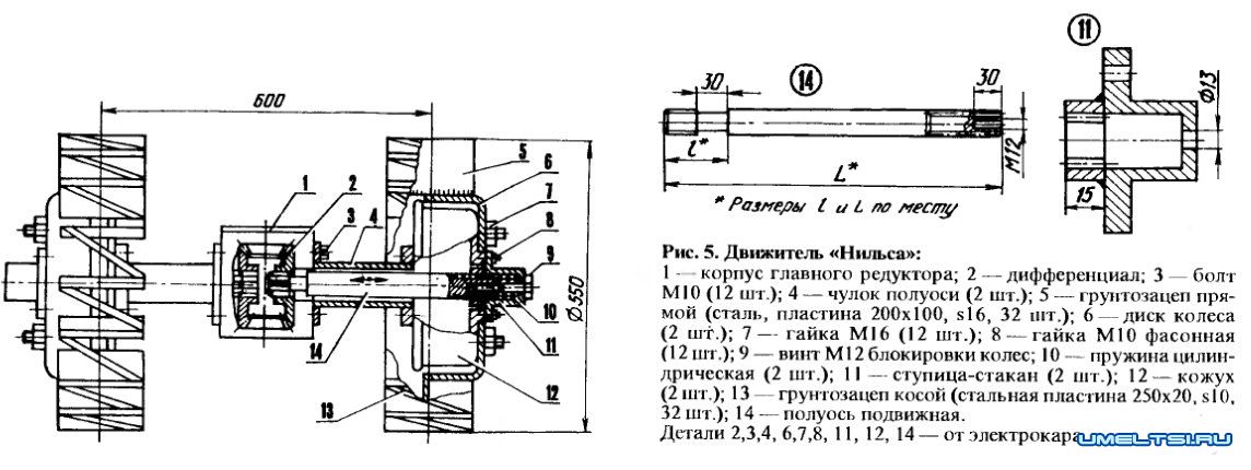 Дифференциал главного редуктора мотоблока «Нильс» взят от списанного электрокара отечественного производства, выпущенного до 1980 года, когда его изготавливали укороченным.