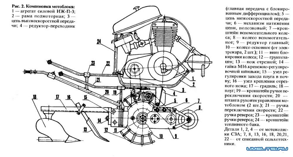 За основу своего первого мотоблока я взял «Вятича», техническое описание, эскизы основных узлов и деталей которого были опубликованы ранее на сайте umeltsi.ru. Однако мои возможности и материально-производственная база отличались от того, чем располагал автор «Вятича». В результате появилась самоделка, мало походившая на исходную конструкцию.