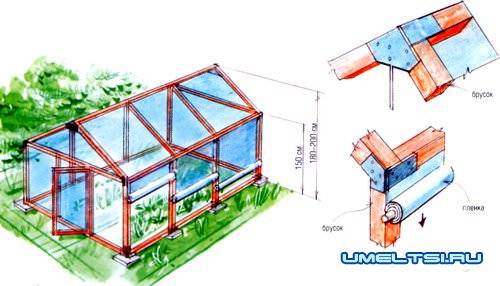 Пленочную теплицу в качестве зимней оранжереи испопьзовать не рекомендуется. Затея эта провалится, поскопьку пленка не способна в нужной мере удерживать тепло внутри конструкции и не пропускать зимние морозы. Однако у пленочного покрытия есть своя положительная сторона: работать с ним сможет даже новичок. Раскроить рулон на фрагменты необходимой величины можно при помощи острого ножа Крепится пленка при помощи гвоздей, но чтобы не порвать этот материал, гвозди забивают через небольшие деревянные рейки. Так и пленка будет плотнее прилегать к каркасу, и молотком ей не будет нанесено никаких повреждений. В каждой теплице должна быть дверь. Делая этот элемент конструкции самостоятельно, особое внимание обратите на то, каким образом она будет крепиться к каркасу. Использовать для этих целей небольшие мебельные петли не рекомендуем, поскольку они очень быстро сломаются. В магазине необходимо выбрать выносные петли. У них ось открывания двери располагается на несколько сантиметров наружу. Дверь на таких петлях прослужит вам верой и правдой долгие годы.