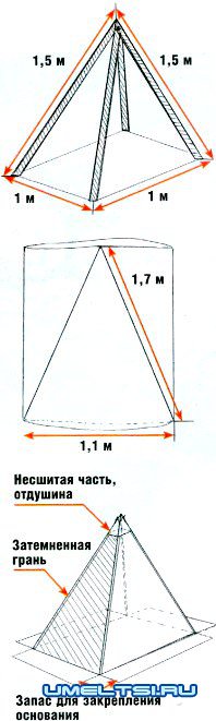 Если сделать одну грань теплицы-пирамиды из затемненного полиэтилена, он послужит отличным экраном. Ранней весной разверните эту грань на север, и она не будет выпускать тепло из теплички. Летом темная грань, развернутая на юг, защитит растения от солнцепека.