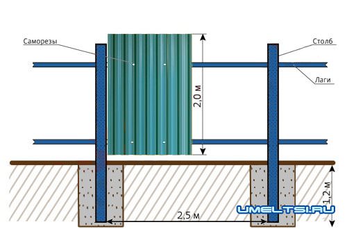 Перед тем как начать строительство забора, в первую очередь необходимо прочитать как это сделать на умельцах.ру а потом идти покупать сам материал. Для забора вам будет нужно профнастил с высотой профиля в 30 – 40 (мм) и толщиной защитного покрытия в половину миллиметра. Кроме самого профнастила, нужно купить трубы 60х40 (мм), только чтобы 3-х метровой длинны, еще трубы 40х20 (мм), также 3-х метровой длинны, саморезы с оцинковкой.