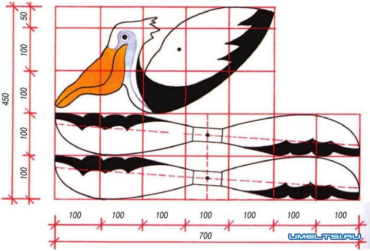 В ветренные дни такой деревянный пеликан с лопастями принесёт весёлое оживление в атмосферу сада. Корпус и лопасти выпиливают лобзиком из фанеры толщиной 6 мм, а затем покрывают детали атмосферостойкой краской.