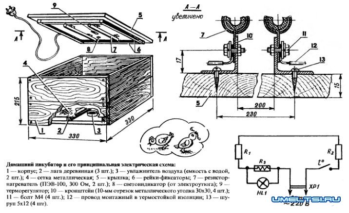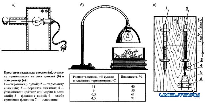 Инкубатор для выведения цыплят в домашних условиях можно быстро смастерить, имея терморегулятор с индикатором включения в сеть и электрошнур со штепсельной вилкой (например, от перегоревшего утюга), пару 300-омных трубчатых проволочных резисторов типа ПЭВ-100, две емкости под увлажнитель воздуха, металлическую сетку с ячейками 5x5 мм да сосновые доски. А для контроля за процессом инкубации желательно обзавестись еще любыми (даже самодельными) психрометром, сушилкой и овоскопом.