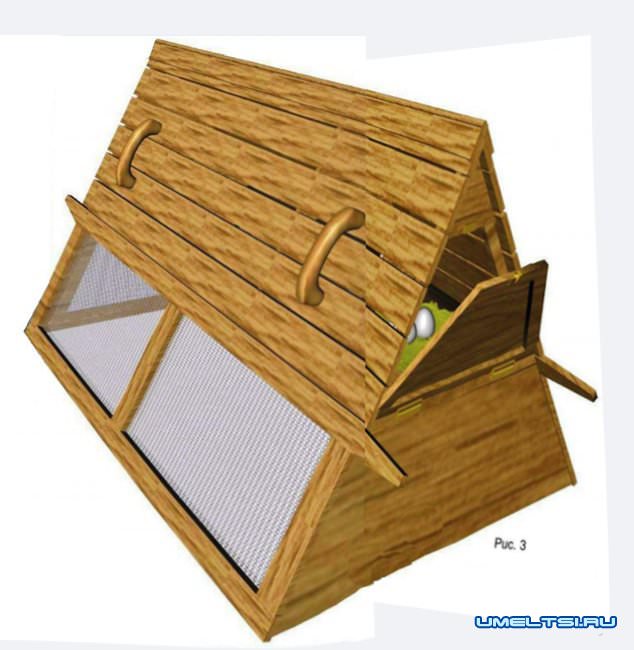 Решение подсказала журнальная публикация с фотографией мини-курятника, который можно устанавливать в удобном для вас месте. Показала фотографию мужу, а он изготовил это чудо-сооружение, которое вызывает неизменный восторг у каждого, кто его видит. Теперь у нас и куры есть, и цветы с грядками в безопасности. Думаю, по нашим схемам каждый домашний умелец сможет сделать такой переносной птичник.