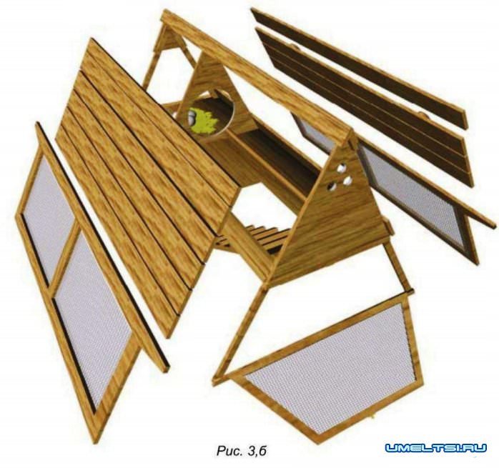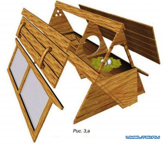 В боковых стенках сделаны с одной стороны — вход для кур, а с другой — люк для сбора яиц (рис. 3,а, 3,6). Поскольку древесина под открытым небом может немного разбухать, между крышкой и основанием нужно оставлять зазоры.