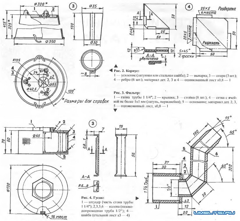 1 — прокладка; 2 — шайба; 3 — корпус; 4 — фильтр; 5 — поплавок; 6 напорный штуцер (первый вариант); 7 — всасывающий патрубок заготовок для гусака и их сварка производились с помощью специального довольно простого стусла и кондуктора, разработанных и изготовленных мною и подробно описанных в журнале «Моде-лист-конструктор».