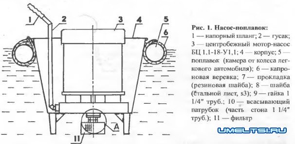 Электронасос ВЦ 1,1-18-У 1,1 непогружной, несамовсасывающий. Поэтому, чтобы приспособить его к отбору воды из водоема, я поместил его в корпус — трехведерную выварку, на верхнюю кромку которой привязал автомобильную камеру от легковушки в качестве поплавка. Через отверстие в днище корпуса всасывающий патрубок насоса вывел наружу, установил резиновую прокладку и закрепил гайкой с трубной цилиндрической резьбой 1 1/4" (такая резьба обусловлена конструкцией насоса). При отборе воды из колодца или естественного водоема на выступающий конец патрубка навинчивается самодельный фильтр.