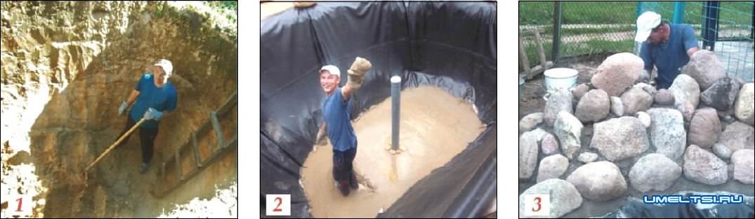 Благодаря такой прочности, пленку можно укладывать, повторяя рельеф ямы. С этой работой помогли специалисты — сварили герметичные швы, что препятствует вытеканию воды.