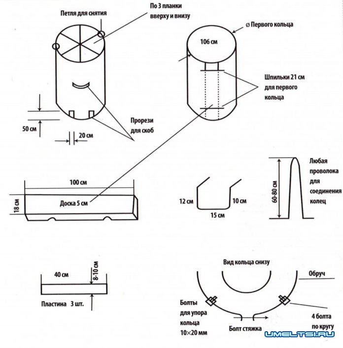 4. На внутренней опалубке прорезаем отверстия для скоб. Скобы делаем из 16-миллиметрового прутка размером: длина 100 см, ширина 150x100 см (см. чертеж). Скоб идет по 2 штуки на кольцо. Шаг получается 50 см друг от друга. В этом случае не надо придумывать никаких лестниц внутри.