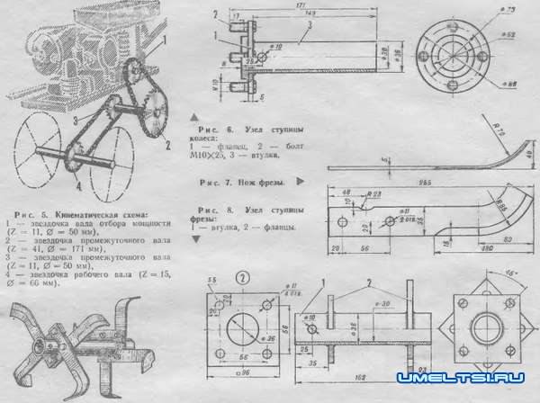 Несколько слов о ходовой части н рабочих органах. Как уже говорилось, замена фрез на колеса — минутное дело, надо только снять ступицы фрез и надеть ступицы с колесами Каждая из них состоит из втулки, фланца и четырех пальцев: соединение их между собой сварное. Пальцы имеют резьбу под гайки для закрепления на них диска колес. Кроме того, во втулках просверлены отверстия 010 мм — такие же имеются на концах рабочего вала: когда ступицы с колесами надеваются на вал, эти отверстия согласовываются я В них вставляется чека.