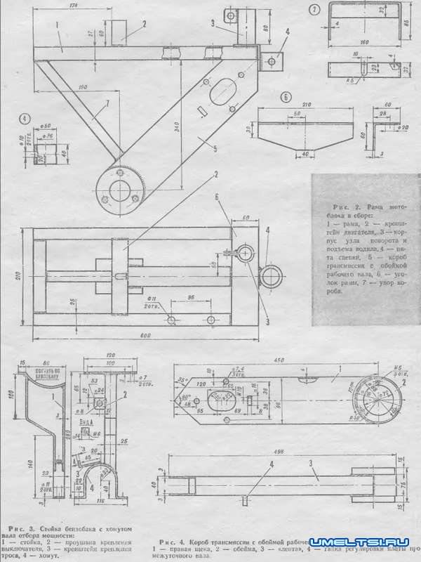 Рама мотоблока сварная и представляет собой четырехугольник (600x210 мм) из коробчатых профилей прямоугольного сечения 27X25 2 мм; задняя часть закрыта уголком. Снизу от нее отходит короб трансмиссии с обоймой главного вузла, поддерживаемый упором. Сверху к раме приварен кронштейн двигателя, поставлен на болтах хомут обоймы вала отбора мощности вместе со стойкой бензобака Хомут изготавливается из стальной пластины шириной 23 и толщина. 3 мм; в ее концах просверливаются отверстия под болты м10. Кронштейн двигателя из двух стальных полос 32 на 4 мм Одна изгибается в П-образный профиль: в центре его — вырез 23 ~ 10мм для болта двигателя; другая — усиливающая — приваривается к ней в верхней части с внутренней стороны.