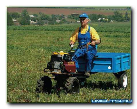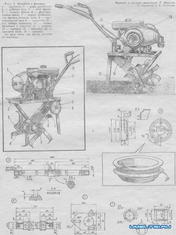 На мотоблоке использован двигатель от мотороллера «Вятка», имеющий воздушное охлаждение, причем принудительное, что дает ему возможность длительное время работать с максимальными нагрузками. Небольшие переделки относятся к рычагу сцепления, карбюратору, системе запуска двигателя, к коробке передач. Так, для удобства управления рычаг сцепления развернут на 180": от его стержня у самого основания отпилен палец, перенесен на другую сторону стержня и здесь приварен Это позволило поставить рукоятку сцепления под левую руку и уменьшить длину перелающего троса.