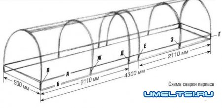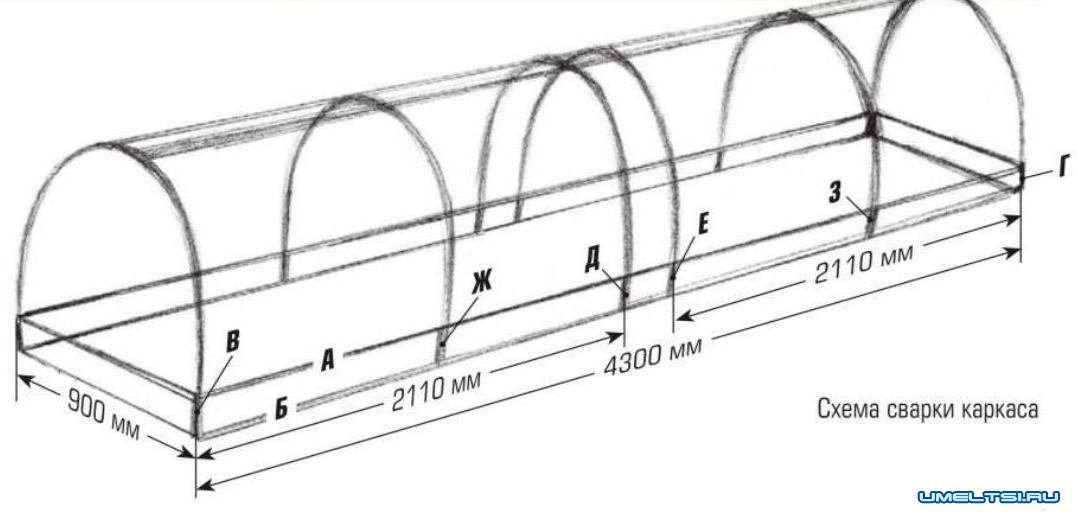 Теперь вам необходимо найти и отметить середину конструкции парника. Отступите по 10 см в обе стороны от середины и в этих местах приварите по малому профилю (Д и Е). Таким образом, расстояние между ними должно быть 20 см.