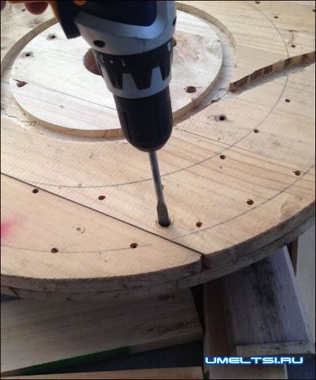 6. Пером просверливаем отверстия для стяжки обеих половинок будущего кресла-качалки. Что бы было все ровно, необходимо просверлить обе щеки за раз. Таким образом шпильки будут перпендикулярно к щекам барабана.
