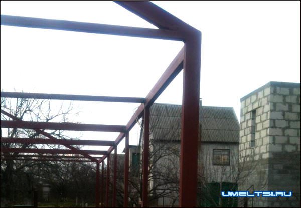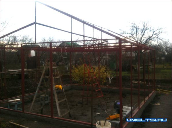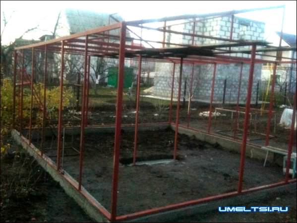 Для каркаса используются трубы длиной до 6 м. Чем толще стенка трубы, тем лучше ее проваривать. Если труба тонкая, то металл быстро прожигается. Вам пригодится болгарка, станок по металлу и сварочный аппарат. Этапы сборки можно проследить по фото. В центре парника сооружаются две опоры. Они устанавливаются таким образом, чтобы в парнике оставалось свободное место. Трубы, которые используются для каркаса, заранее красятся.