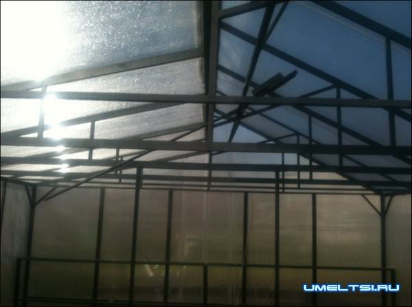 Поликарбонат являет собой полимерный пластик, состоящий из нескольких слоев. Он похож на прозрачную пластмассу, но внутри видно, что он разделяется на секции, заполненные воздухом. Поликарбонат очень прочный, легкий и устойчивый к нагрузкам. Он выдерживает критические температуры, не крошится и не ломается, хорошо рассеивает солнечные лучи. Следует отметить, что такой парник абсолютно безопасный для здоровья человека.