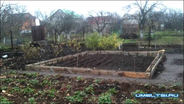 Переходим к рабочему процессу. Прежде всего, необходимо подготовить участок для будущего парника. Выберите ровное место, разметьте его с помощью труб, вбитых по углам. По всему периметру необходимо снять плодородный грунт для того, чтобы удобрить землю опавшими листьями, ветками и лошадиным навозом. Сверху участок засыпается плодородным грунтом.