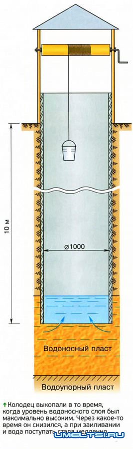 Мы довольно тщательно расспрашивали всех соседей о том, какой глубины у них колодцы и в какое время они их копали, - и сопоставили данные с тем, что произошло с нашим колодцем. Картина стала вырисовываться более полно. Недостаточный объём воды в нашем колодце начал ощущаться в течение уже первого года эксплуатации. Строили колодец весной при максимально высоком уровне вод. Очевидно, что шахту при строительстве колодца вырыли на недостаточную глубину. То есть копать перестали, когда вода стала поступать заметными темпами.