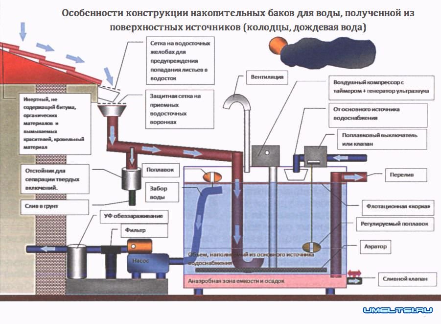 В идеале схема водоснабжения из промежуточной емкости, накапливающей колодезную и дождевую воду, может включать в себя поверхностную или подземную емкость. Ее обязательно нужно оборудовать переливом - для отвода излишнего объема воды в дренажную систему. У себя я использовал упрощенную схему из двух бочек, в одной из которых вода собирается с крыши и перекачивается погружным центробежным насосом, подключенным через поплавковый выключатель во вторую, поднятую на высоту напорную бочку внутри помещения. Из напорной бочки вода, проходя через механический фильтр тонкой очистки, подается в систему водоснабжения (душ, умывальник, туалет) насосом с подключенным реле давления. Как только давление в системе падает при открытии крана, насос начинает нагнетать воду под давлением. В напорную бочку для улучшения качества воды можно было бы добавить стандартный аэратор для прудов, который нагнетает воздух под давлением на дно бочки. Пузырьки воздуха, проходя через воду, способствуют окислению органических веществ и недоокисленных растворимых минеральных соединений и препятствуют размножению анаэробных сернокислых бактерий, придающих воде запах затхлости.