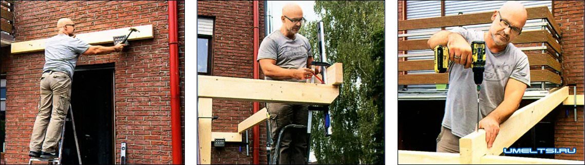 20. Короткие стропила упираются в средний прогон и привинчиваются сзади. Опорой служит доска, зафиксированная струбциной снизу.