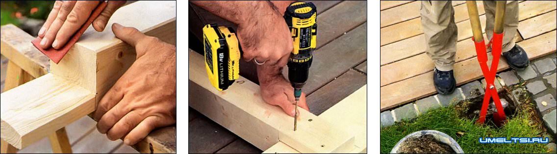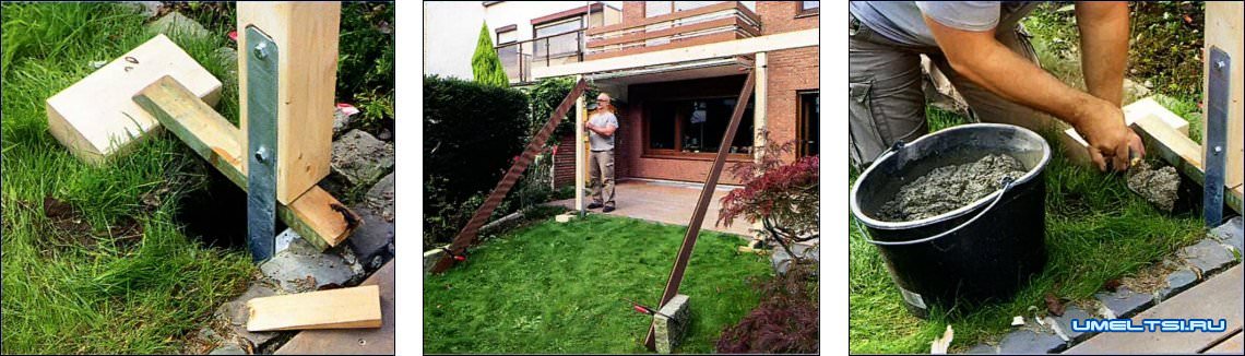8. Стойки установить анкерами на подложенные доски, чтобы нивелировать высоту.