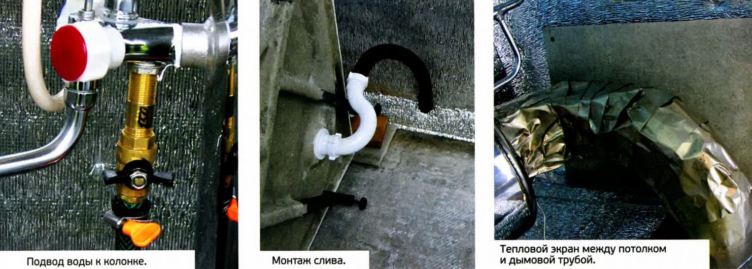 Трубу из нержавейки подходящего для колонки диаметра купил в ближайшем магазине печек. Взял два прямых отрезка (длиной 0,5 и 1,0 м), три поворота на 90°, а также «грибок» на трубу. После сборки двух поворотов внутри стало ясно, где труба должна проходить сквозь стену. Проход сделал из реек и старого кровельного железа, проложив пятно контакта листовым асбестом. Изнутри на не обшитое ранее место стены прикрепил ППЭ, а снаружи-обрезки фанеры. Собрал последний внешний поворот, трубу 1 м и грибок. Крепить трубу к душевой не стал - практика показала, что трения вполне достаточно для сопротивления ветру (иногда можно поправить), а на зиму я трубу снимаю, оставляя только «грибок».