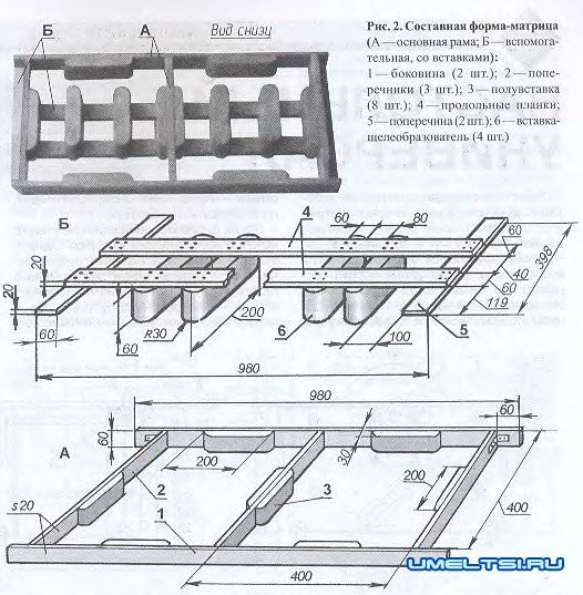 Основная рама (рис.2,А) устанавливается на ровную, покрытую полиэтиленовой плёнкой бетонную поверхность (подойдёт и ровная, посыпанная песком земляная). На неё укладывается вспомогательная с серединными вставками, и форма равномерно заполняется раствором. Чтобы взаимное расположение рам всегда было одинаковым, необходимо поперечные ппанки вспомогательной рамы Б укладывать между выступающими концевиками рамы А. Тогда положение срединных вставок всегда окажется точно посредине формы.
