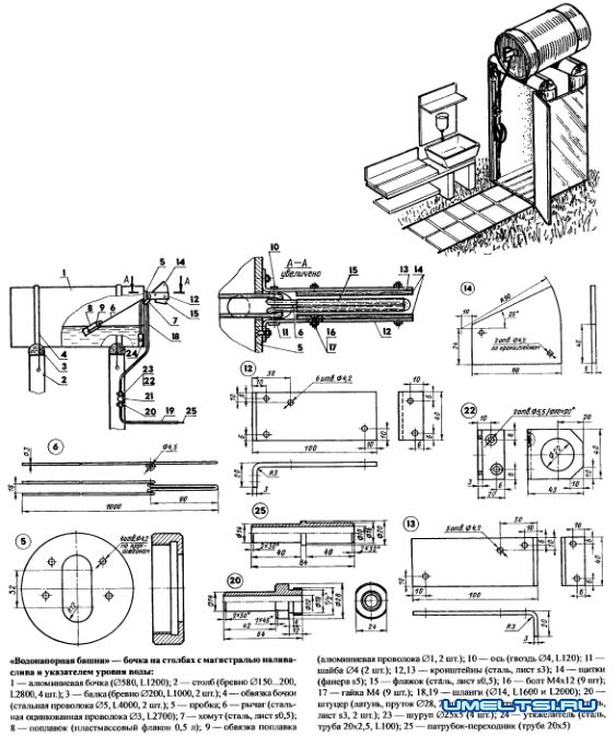 Приведенные на рисунках размеры даны для стандартной алюминиевой бочки длиной 1200 и диаметром 580 мм, с отверстием под пробку диаметром 56 мм. Любой умелец сообразит, как изменить размеры деталей для другой, имеющейся у него бочки. Для налива бочки нижний конец шланга соединяют с водопроводной магистралью или насосом и открывают вентиль. При наполнении бочки флажок указателя уровня вместе с концом рычага, поворачиваясь, опускается и выходит за пределы закрывающих его щитков на кронштейнах. При достижении предельного уровня, еще до перелива, что видно по максимально вышедшему флажку («опасная» зона флажка — красная), вентиль закрывают, и «водонапорная башня» готова отдавать воду. Для этого достаточно только опять открыть вентиль. При опорожнении бочки флажок указателя уровня будет подниматься и уходить за щитки. Если флажка почти не видно (а для лучшего зрительного восприятия его нижняя часть окрашена в белый или голубой цвет), значит, воды в бочке мало и ее нужно снова наливать.