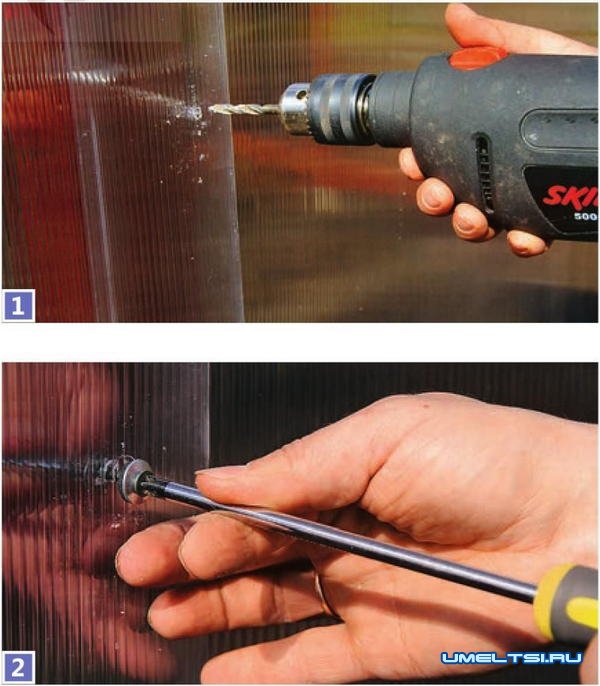 ■ Крепление поликарбоната имеет свои тонкости: для того, чтобы температурные колебания не привели к растрескиванию поверхности листа в местах крепления, заранее просверливают отверстия, диаметр которых должен превышать диаметр саморезов на 4-5 мм (фото 1). Чтобы в отверстия не затекала влага и саморезы не проваливались внутрь, используют шайбы с резиновой прокладкой (фото 2).