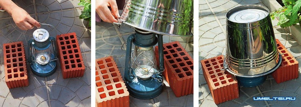 5. Накрываем ее железным ведром. Ведро опирается на кирпичи, поэтому керосиновая лампа накрыта не полностью -есть доступ воздуха, а значит, возможно ее длительное горение.