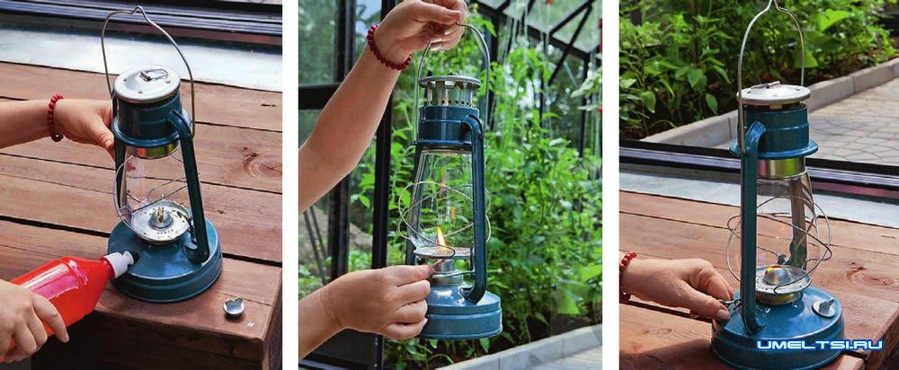 1. Наливаем керосин в керосиновую лампу. Кстати, именно эту модель называют «Летучая мышь», и она была придумана немцами в XIX веке.