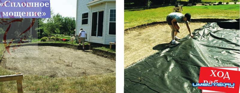 2. Укладывают на площадку по всей ширине котлована плотный геотекстиль, тщательно расправляя складки. По краям фиксируют ткань кирпичами или деревянными брусками. На круглой площадке отмечают центр.