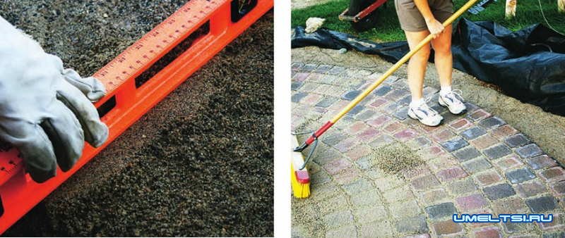 7. Постепенно подсыпают и утрамбовывают песок по мере удаления от центра. Проверяют насыпные слои и горизонтальность кладки с помощью уровня. Чтобы мощение со временем не разъехалось, фиксируют края бордюрными камнями.