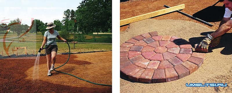 1. Предварительно разложите плитки по нужной схеме в том месте, где вы решили обустроить место отдыха, «прикиньте» их раскладку.