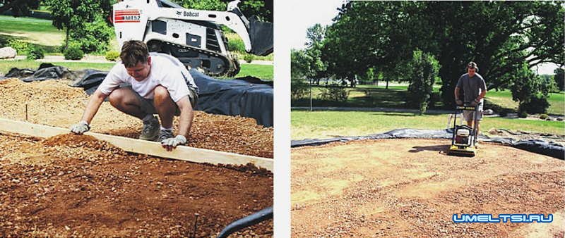 3. Засыпают площадку двумя слоями мелкого гравия, смешанного с песком, по 5-7 см каждый. Выравнивают первый слой и хорошенько трамбуют. Второй слой гравия ровняют по маякам, в качестве которых используют две трубы.