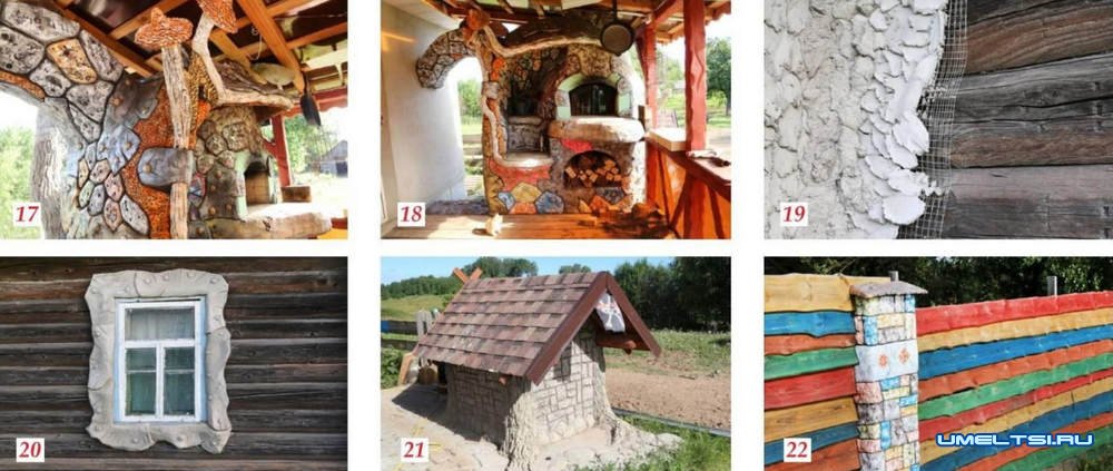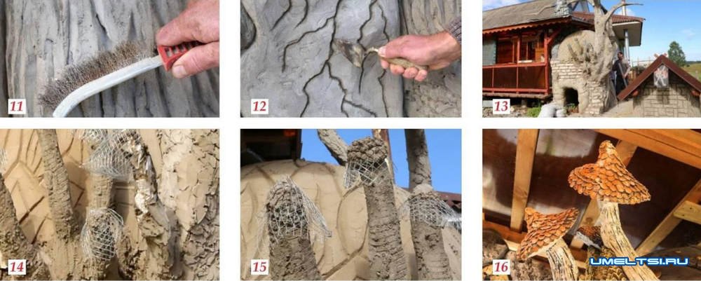 Внутренней отделкой дома я не ограничился, постепенно стал украшать зону отдыха. Помпейскую печь сложил из кирпича. Купол утеплил термоватой. Сверху накрыл ее спандбондом и металлической сеткой с ячейкой 10x10 мм (фото 9) Развел цементно-песчаный раствор в соотношении 1:3. Нанес его слой на сетку (фото 10), с помощью мастерка и жесткой металлической щетки сформировал декоративный камень и кору дерева (фото 11, 12) На чуть схватившемся составе неровности и шероховатости убрал с помощью влажной кисти. Для декоративных веток и грибов закрепил металлические прутки, изогнув их по задумке. Некоторые части каркаса сварил между собой для большей надежности (фото 13). Чтобы раствор не проваливался, поместил внутрь каркаса смятую бумагу и газеты (фото 14). Сверху прутков намотал металлическую сетку и на нее нанес раствор (фото 15) Оформил всю печь по своему вкусу, сочетая разные фактуры: дерева, кирпича, металлических накладок и глиняной обмазки. Облицовку после просушки загрунтовал и покрасил (фото 16-18).